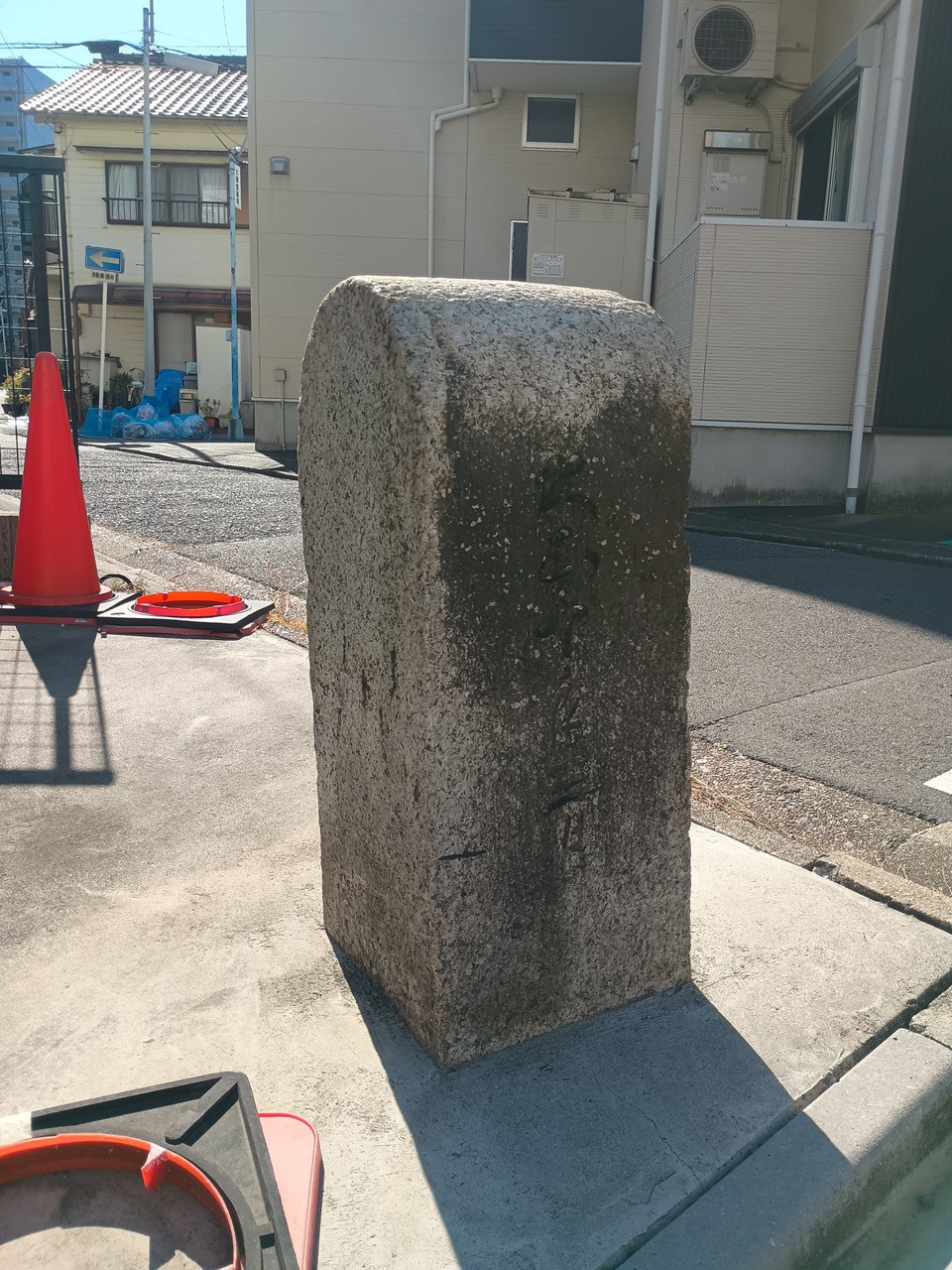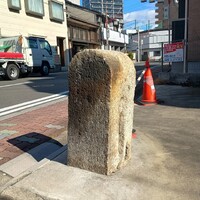 中村遊郭周囲の水路に架けられていた橋の親柱。花崗岩製で、側面に「大正十年三月」と刻まれている。大正10年(1921)は、大須地区にあった旭郭が中村地区に移転するために土地の造成が始まった年である。かつての水路は暗渠となり細い道となっている。