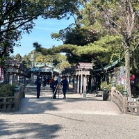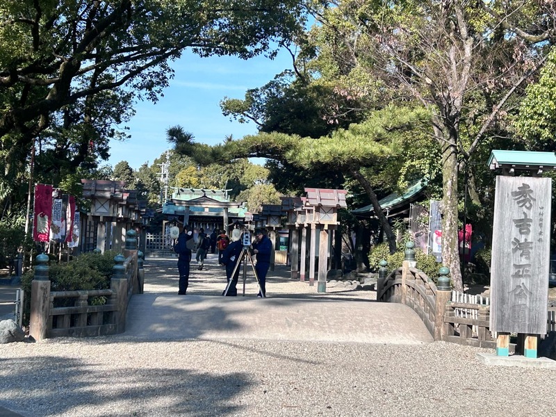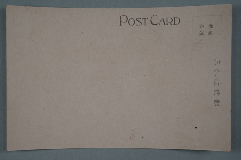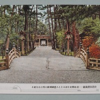 豊国神社と、神社へ延びる道を正面から撮影した絵はがき。白黒で撮影後に着色が行われたと思われ、非常に色鮮やかな仕上がりが特徴的である。
