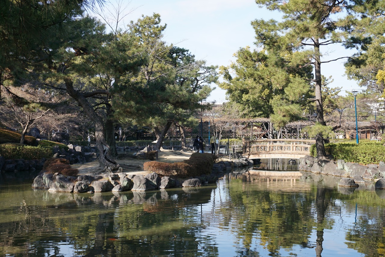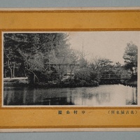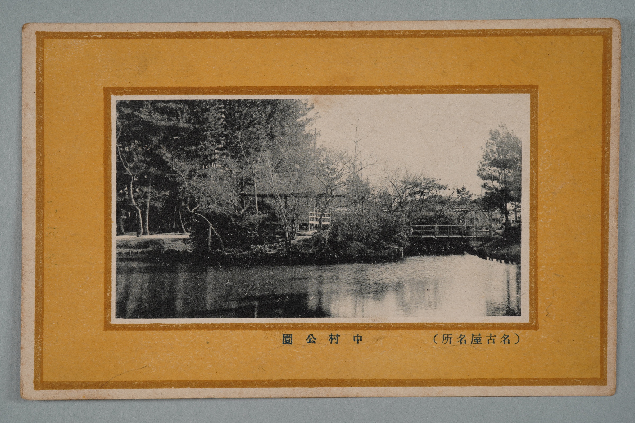 中村公園内にある瓢箪池のほとりから撮られた画像。写真の周りは黄色い枠で飾られている。写真中央には東屋が確認できるが現在は残っていない。